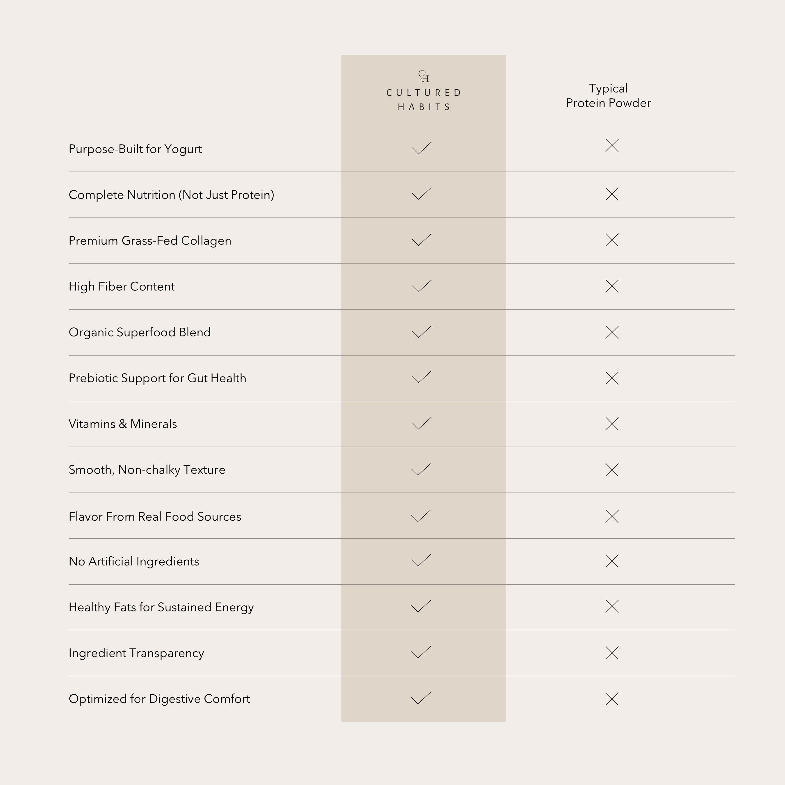 Unlike generic protein powders, our blends are specifically formulated for yogurt's unique chemistry, with balanced nutrition, compatible flavors, and texture that transforms without grittiness. We go beyond protein to include fiber, superfoods, and gut-supporting ingredients.